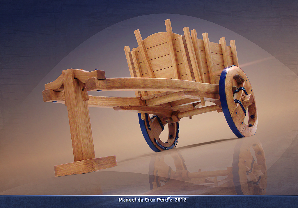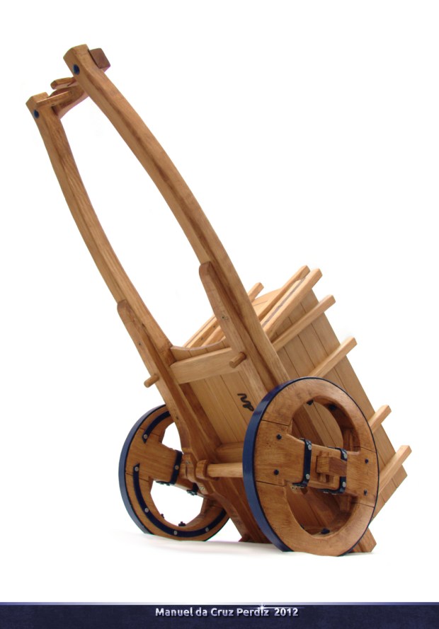 Miniatura de carroça de madeira com adornos em aço;