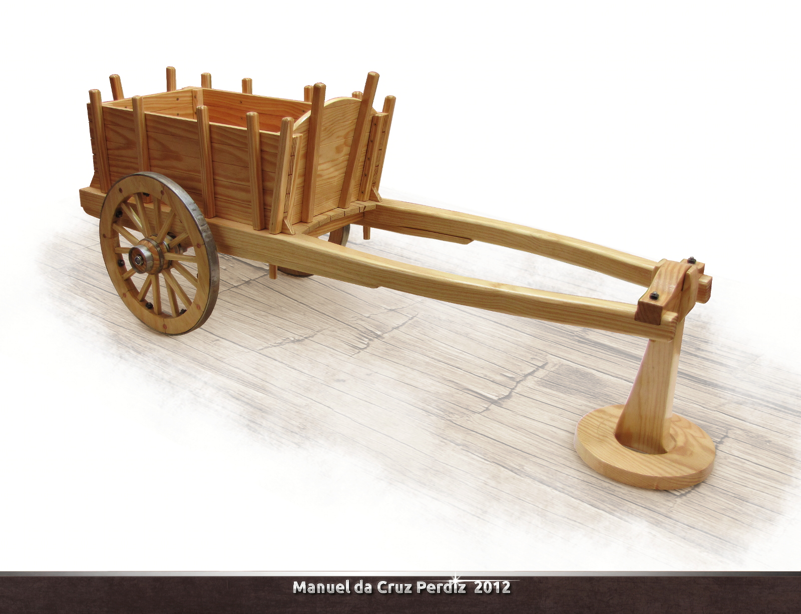 Miniatura de carroça feita com madeira de pinho e adornos de aço e cobre.